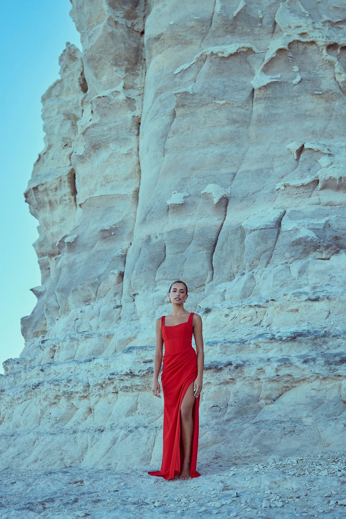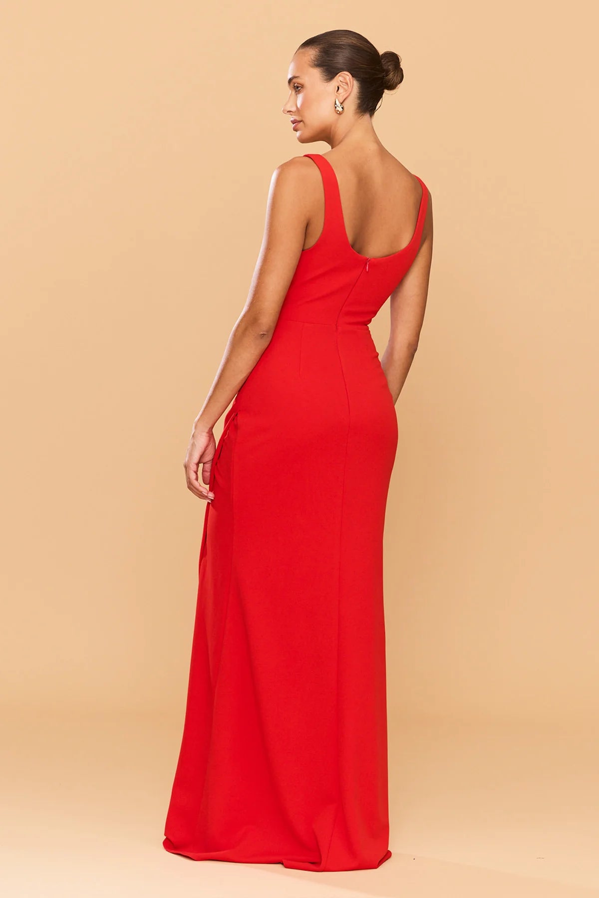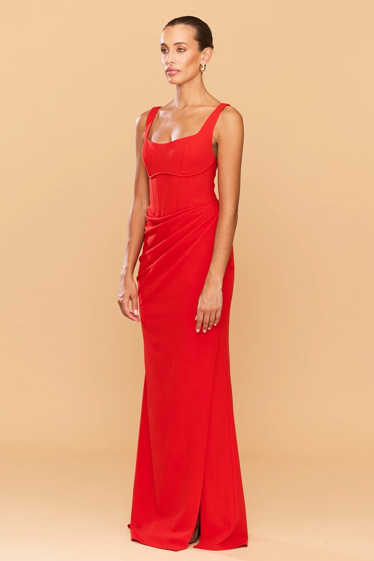 Step into elegance with the Elena Gown designed to sculpt and accentuate the female form. The full-length gown exudes timeless sophistication, featuring a structured bodice with a 90's inspired square neckline and a curved under bust pipping detail. The draping cascades gracefully along the waist, leading to a cross over split that can be worn either closed or open. Made from our premium stretch bonded crepe fabric, the Elena Gown combines comfort with style.